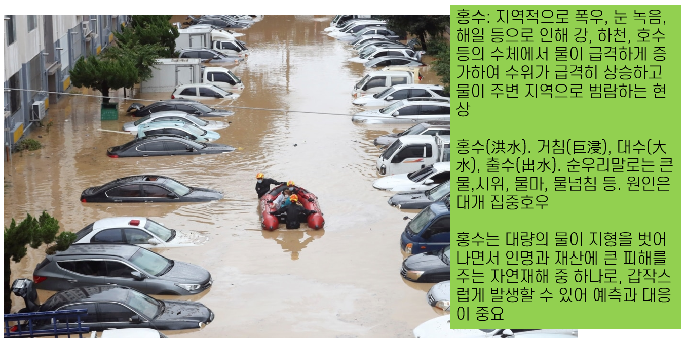 홍수는 지역적으로 폭우, 눈 등과 같은 것으로 인하여 강과 호수 등의 수체에서 급격하게 물이 상승하여 주변 지역으로 범람하는 현상을 말합니다. 홍수는 거침, 대수, 출수라고도 하며 순우리말로는 큰물, 시위, 물마, 물 넘침이라고도 합니다. 홍수는 대량의 물이 덮치면서 인명과 재산피해를 발생시키는 자연재해 중의 하나로 언제든지 발생할 수 있으므로 발생을 예측하고 대비하는 것이 매우 중요합니다.