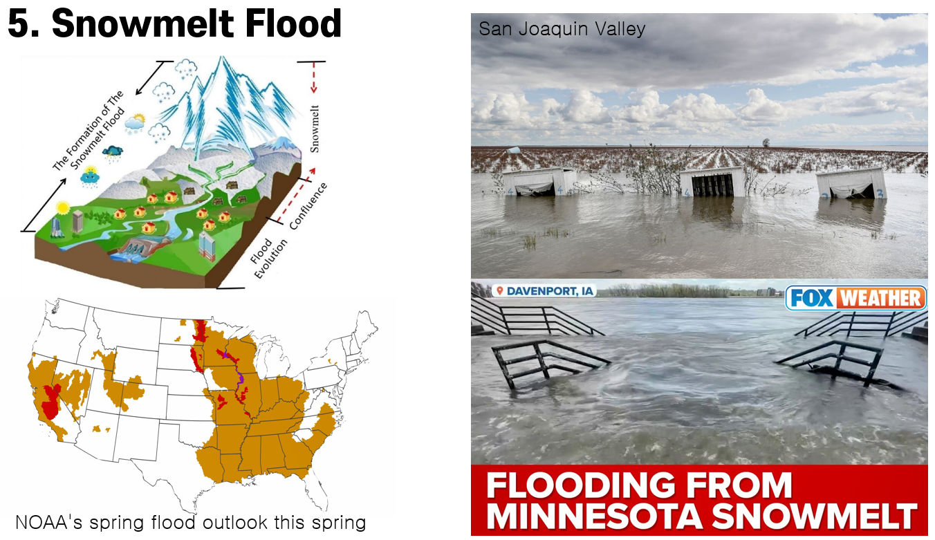 또 산사태 등의 원인이 되기도 합니다. 산악 지대에서 비가 강하게 내리면 토양이나 암반이 산사태가 발생하고 이로 인하여 많은 양의 흙, 암반 그리고 나무 등이 강의 유입되어 흘러넘치게 되어 주변에 홍수가 발생할 수 있습니다. 그리고 인위적 요인으로 빗물 배수 시스템 불량으로 발생할 수 있습니다. 통상적인 양의 비가 내리더라도 정상적으로 배수가 작동하지 않으면 도시에서 물이 차올라 홍수가 발생할 수 있습니다. 이는 자연적 요인과 인위적 요인이 합쳐진 홍수가 됩니다.