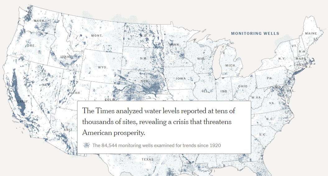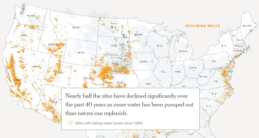 과거 풍부한 지하수는 미국을 만들고 광대한 도시들과 농장을 만드는데 일조하였습니다. 그러나 이제는 미국인들이 그러한 유산을 낭비하고 있습니다. 뉴욕 타임스가 미국 전역 8만 4천여 개의 지하수관정 자료의 분석을 통해 미국의 번영을 위협하는 큰 위기를 보고하고 있습니다.