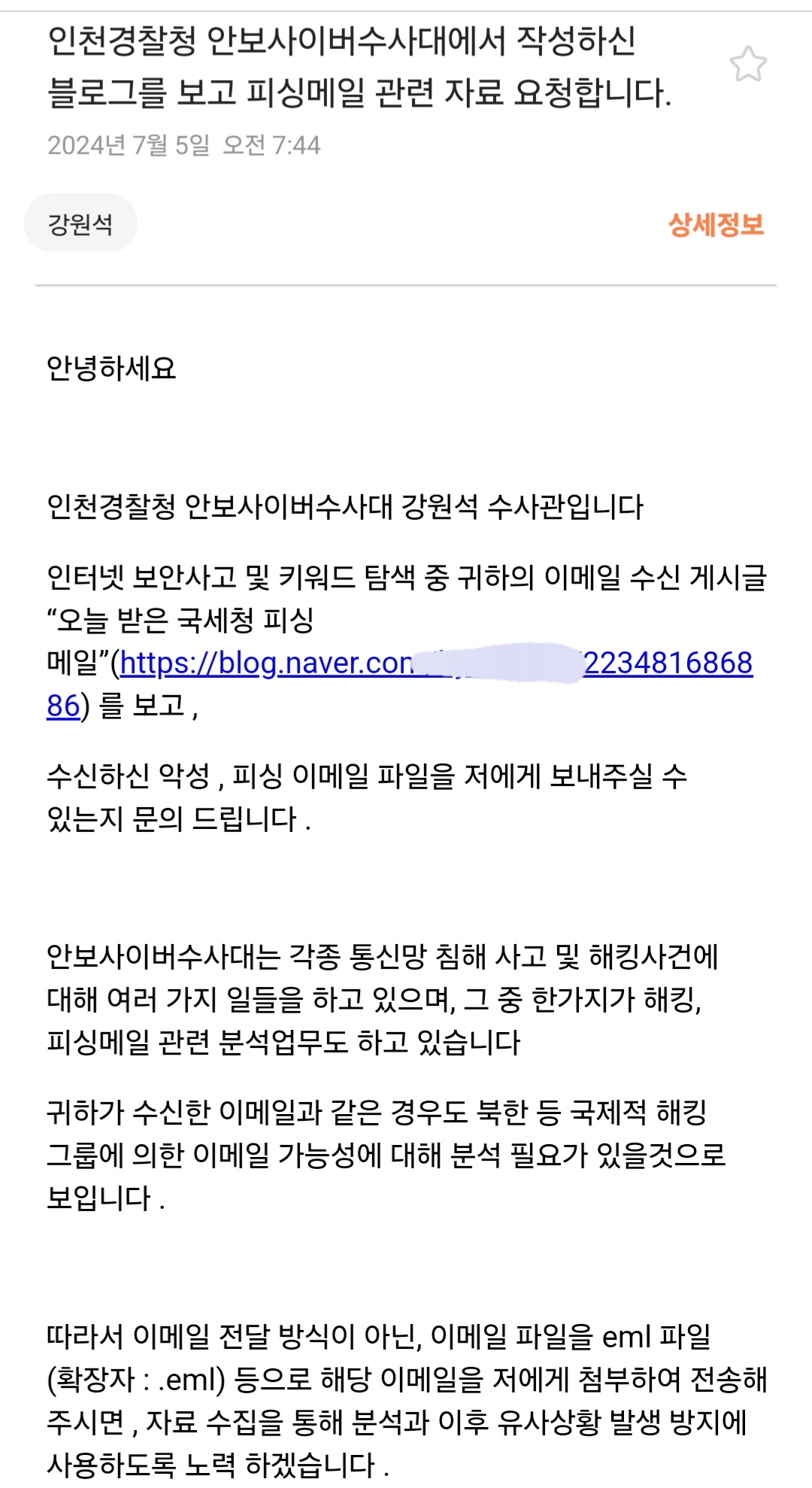 그리고 그것을 블로그에 올렸더니 무슨 인천경찰청 안보사이버수사대의 강원석 수사관이라는 사람이 이메일을 보내 제가 받은 피싱메일을 자기에게 좀 보내달라고 합니다. 그리고 자기에게 이런 이메일 받았다는 것을 외부로 알리지 말라고 합니다. 참 기가 막혀서 무슨 수사관이 이메일로 일을 합니까?