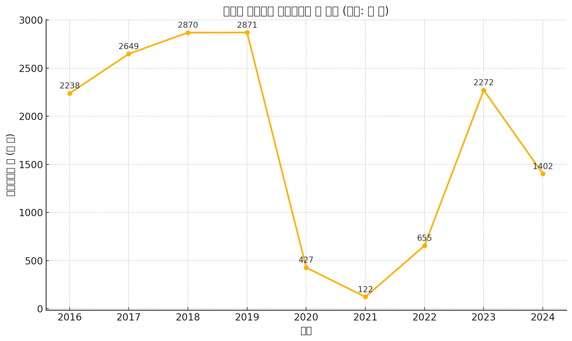 2020년과 2021년: COVID-19 팬데믹의 영향으로 해외여행객 수가 급감하였습니다. 2020년에는 약 427만 명으로 전년 대비 85.1% 감소하였고, 2021년에는 약 122만 명으로 추가로 71.4% 감소하였습니다.