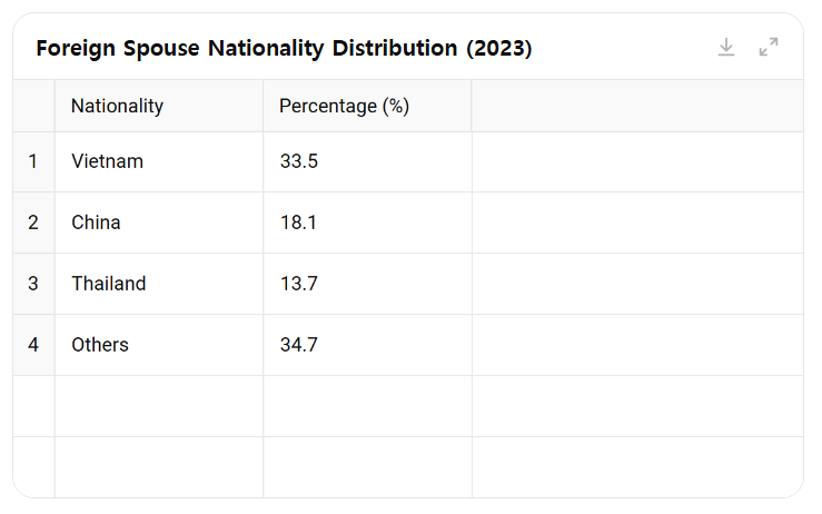 이러한 통계는 우리나라에서 국제결혼이 점차 증가하고 있으며, 특히 특정 국가 출신의 배우자와의 혼인이 두드러진다는 것을 보여줍니다.