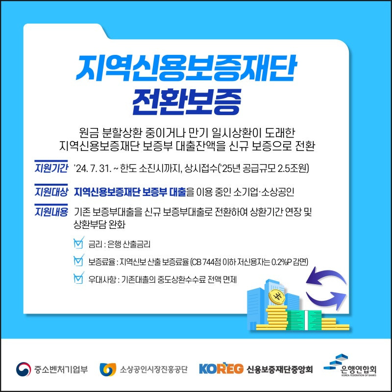 원금 분할상환 중이거나 만기 일시상환이 도래한 지역신용보증재단 보증부 대출잔액을 신규 보증으로 전환해드립니다.