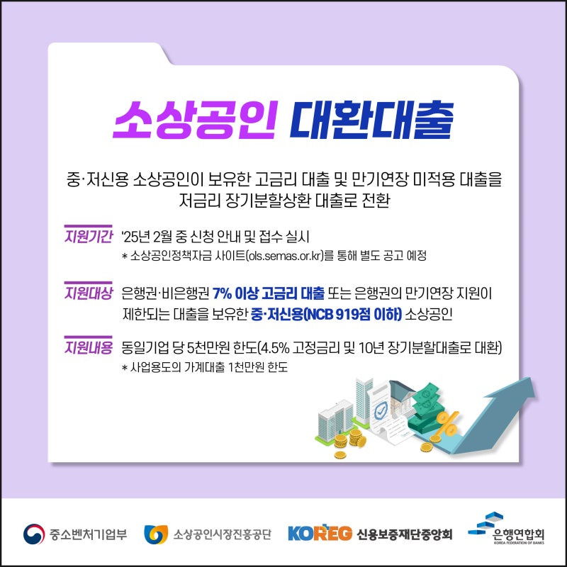 중·저신용 소상공인이 보유한 고금리 대출 및 만기연장 미적용 대출을 저금리 장기분할상환 대출로 전환해드립니다.