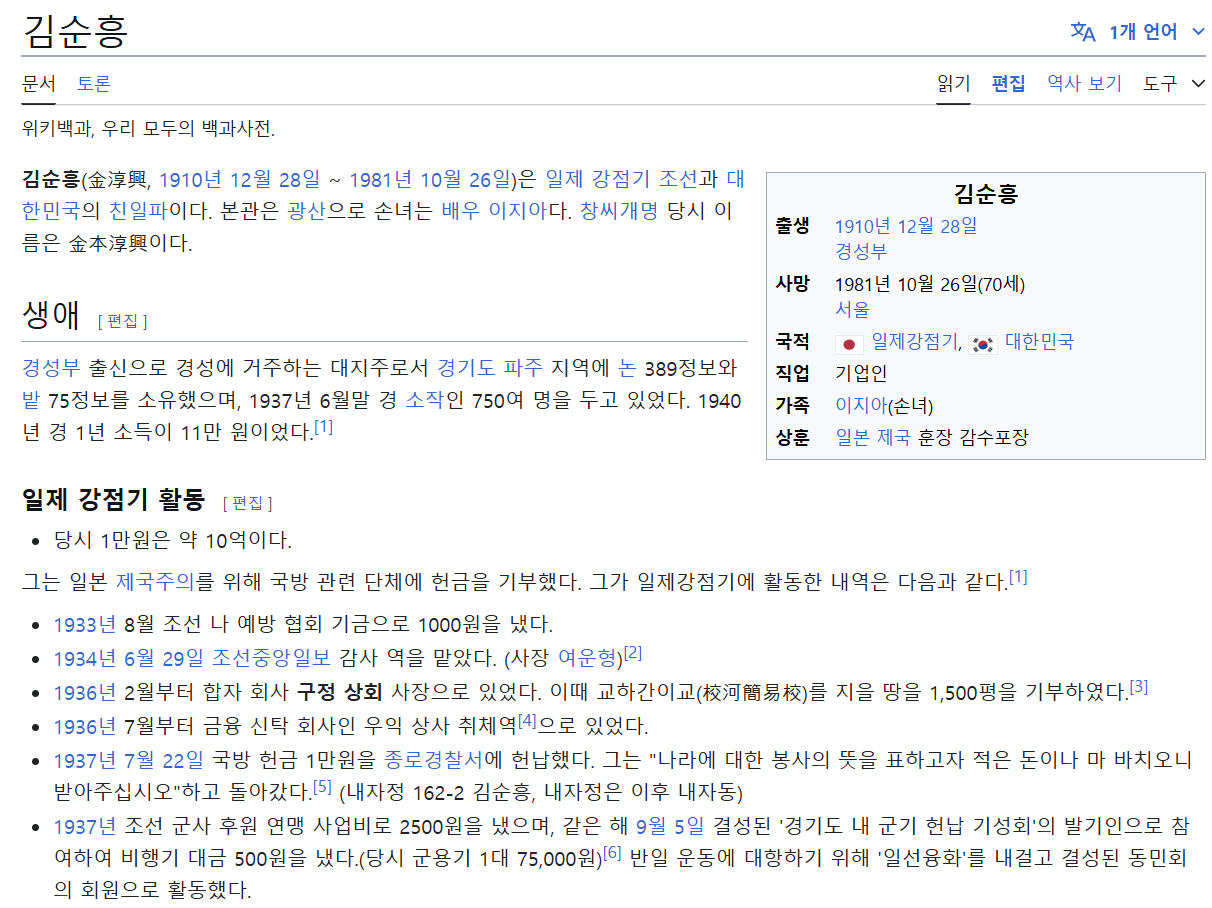 배우 이지아(본명 김지아)의 조부인 고(故) 김순흥은 일제강점기 동안 친일 행적을 보인 인물로 알려져 있습니다. 그는 1933년 조선나예방협회에 1,000원(현재 가치 약 1억 원)을 기부하였으며, 1937년에는 종로경찰서에 국방헌금으로 1만 원(현재 가치 약 10억 원)을 헌납하였습니다. 이러한 행위로 인해 그는 1944년 일본 정부로부터 감수포장을 받았으며, 1948년에는 백범 김구 등 임시정부가 지목한 친일 인사 명단에 포함되기도 했습니다.
