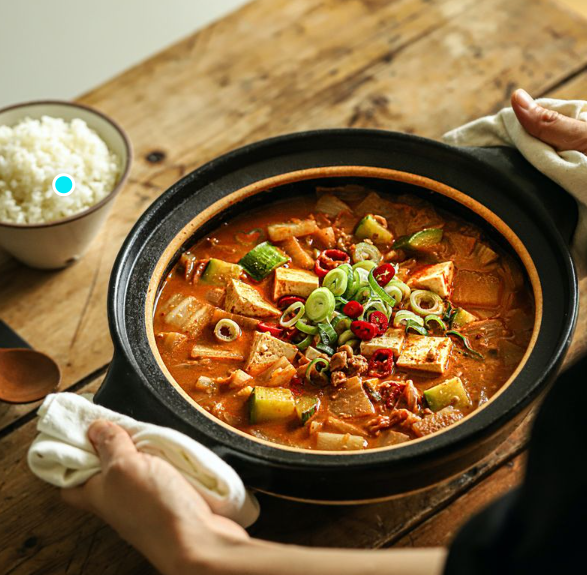 - 된장을 베이스로 한 한국 전통 찌개로, 두부, 감자, 애호박, 고추 등을 넣어 끓입니다.