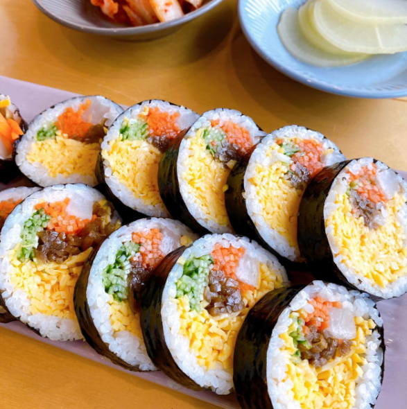 - 밥과 다양한 속재료(단무지, 오이, 햄, 계란 등)를 김에 말아 만든 음식입니다.