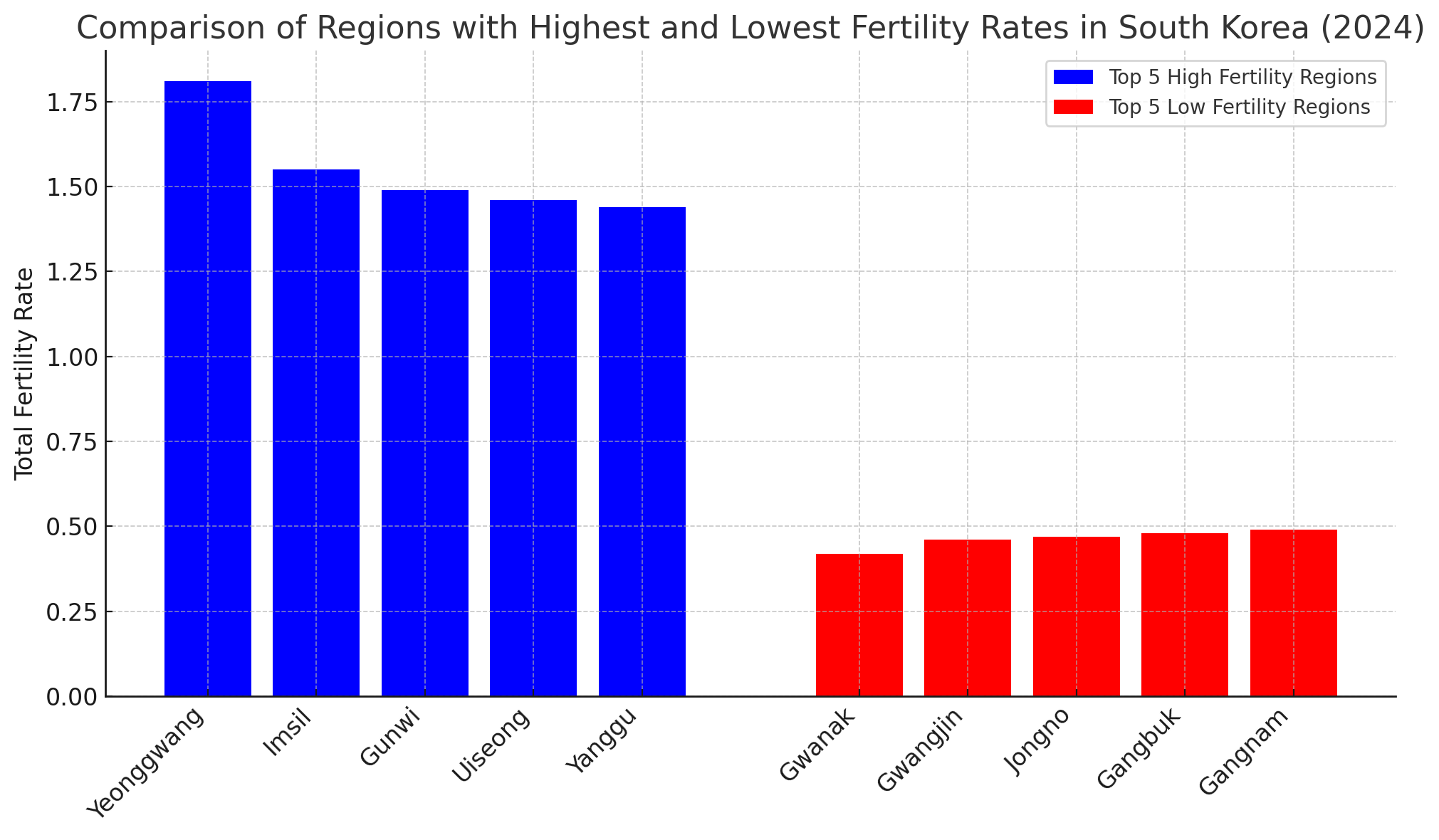 이러한 지역별 출산율 격차는 각 지역의 사회·경제적 환경, 정책 지원, 문화적 요인 등 다양한 요소에 기인하며, 저출산 문제 해결을 위해서는 지역 특성에 맞는 맞춤형 정책과 지원이 필요합니다.