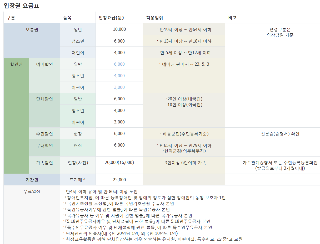 입장권은 인터파크, 네이버 등에서 구매가능하며 구매시 다른 시설이용 등에 대한 할인혜택이 있습니다. 입장료의 경우 성인은 1만 원, 18세 이하 청소년 6천 원, 5~12세 어린이는 4천 원이며 예매 시에는 대폭 할인된다. 4세 이하 어린이와 80세 이상 어르신은 무료이다.