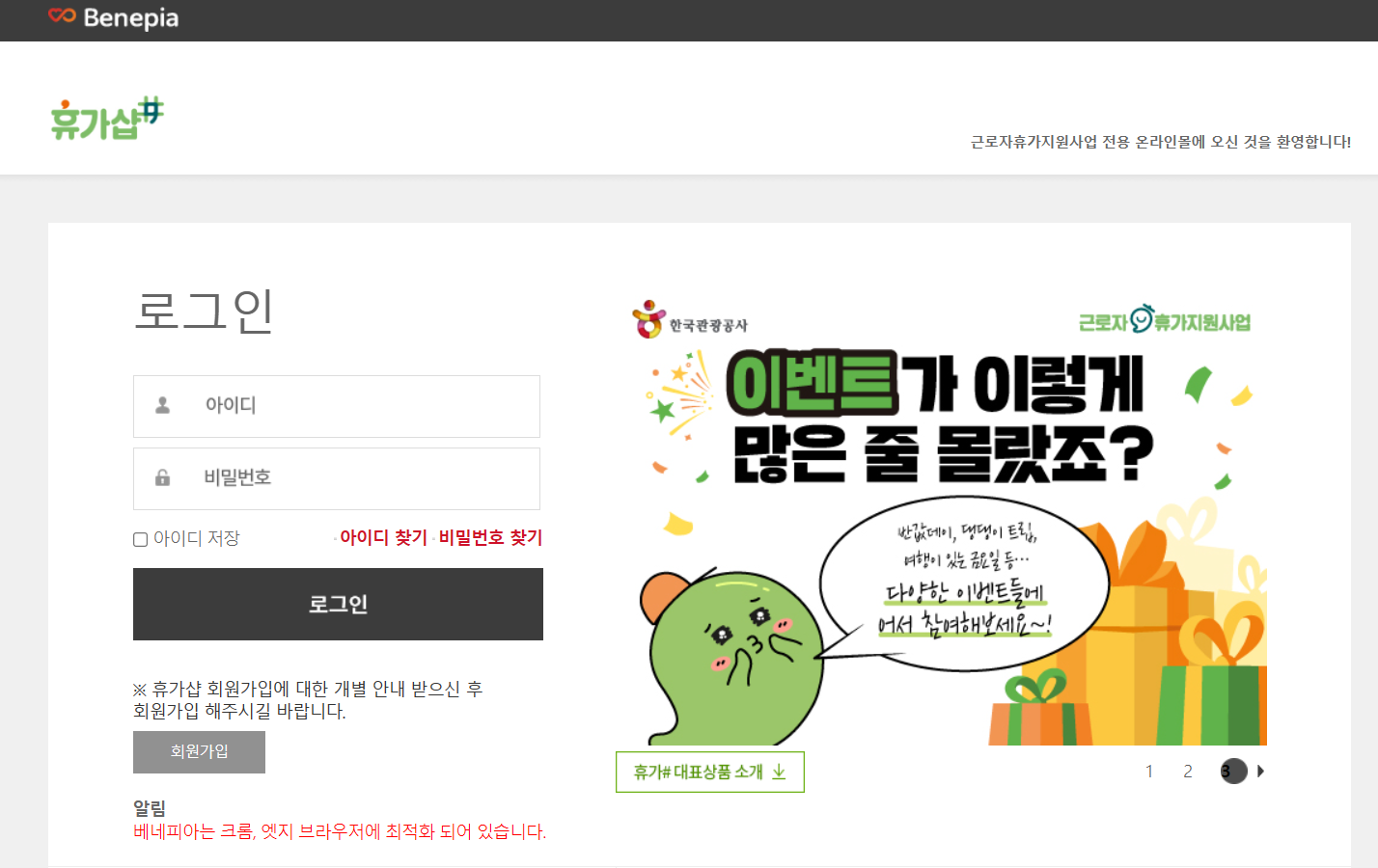 근로자 휴가지원사업을 위한 전용 특정 폐쇄몰로서 참여 근로자들만을 대상으로 운영하고 있습니다. 휴가샵에는 40여 개의 제휴사, 10만 여개의 상품이 있으며 숙박시설, 국내패키지 상품, 레저입장권, 교통편(렌터카, 기차, 항공), 식도락 상품 등 편리하게 구매할 수 있습니다. 여행적립금 40만 원으로 국내여행 상품을 빠르고 자유롭게 구매할 수 있습니다. 휴가샵의 링크는 아래와 같습니다.