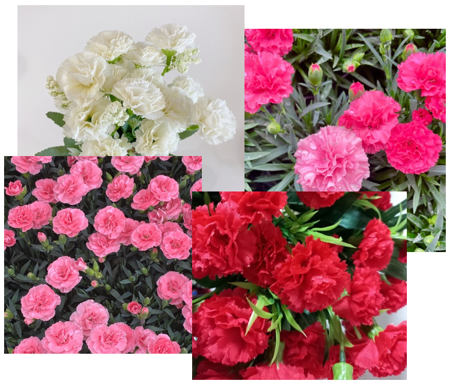 카네이션은 여러 종류가 있습니다. 색깔도 흰색부터 붉은색까지 천차만별 다양합니다. 다음은 카네이션의 대표적인 품종입니다.
