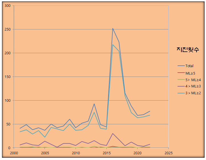 기상청 자료에 의하면 우리나라의 지진은 1978년 이래 규모 4 이상의 지진에 있어서는 유의한 수준의 증감을 말하기는 어렵습니다. 그러나 흥미롭게도 규모 2 이상 지진과 총 지진횟수에 있어서는 확실하게 통계적 유의성 있게 최근에 증가하고 있습니다. 물론 2016-2018의 피크를 기점으로 약간의 감소를 보이고는 있으나 그 전의 시기들과 비교하면 확연하게 증가한다고 할 수 있습니다. 문제는 이렇게 작은 규모의 지진의 증가가 과연 어떤 의미를 가지고 있느냐입니다. 그저 노이즈로 생각해야 할 것인지 아니면 큰 지진에 대한 징조인지는 쉽사리 예단하기 어렵습니다.