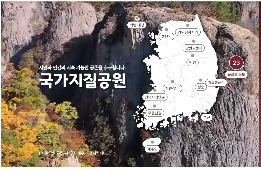 - 울릉도, 독도 국가지질공원: 2012년 12월 27일 지정되었으며 23개 지질명소와 1명의 활동 해설사가 있습니다.