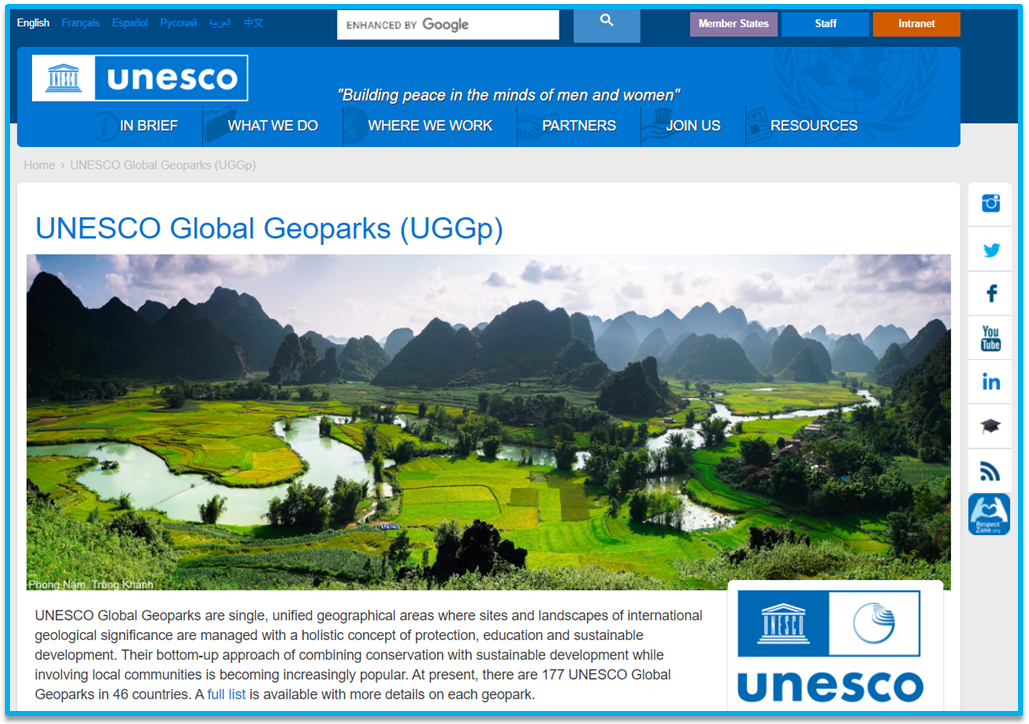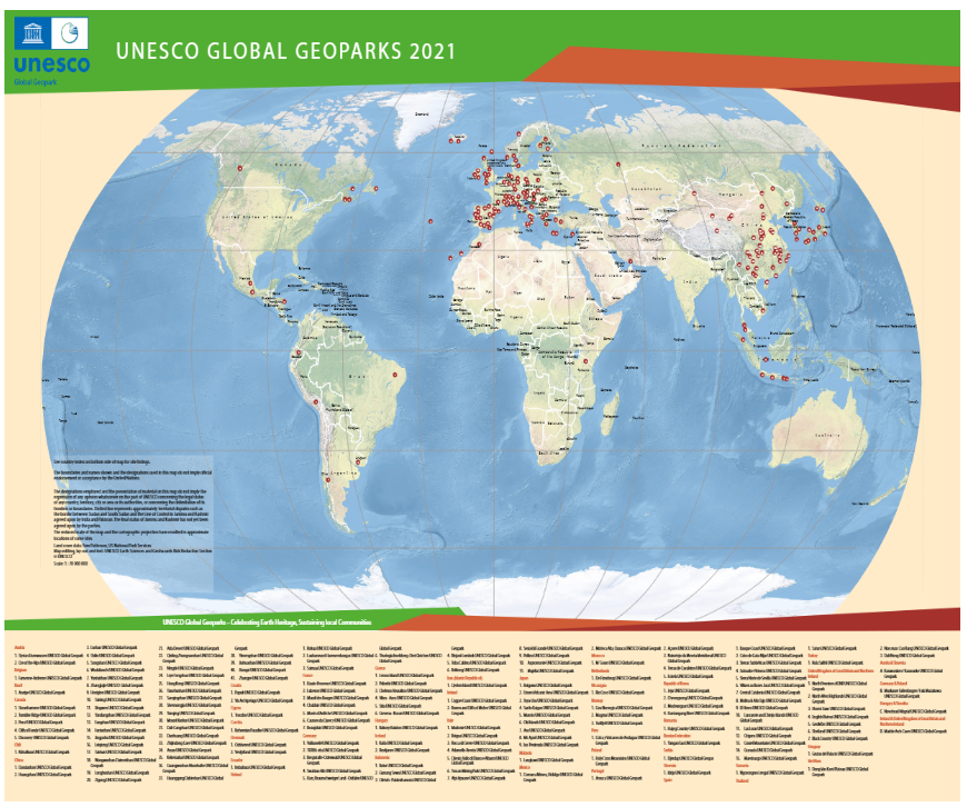 유네스코 세계지질공원은 하나의 통일된 지리적 지역으로 사이트들과 경관들이 국제적인 지질학적 중요성이 있으며 보전, 교육 그리고 지속가능한 개발의 통합적 관점에서 보호되는 곳을 말합니다. 지역사회의 참여와 지속가능한 발전을 결합한 보전의 개념을 기반으로 아래로 부터의 접근이 호응을 얻고 있습니다. 2023년 현재 유네스코 세계지질공원은 46개국 177개가 지정되어 있습니다.