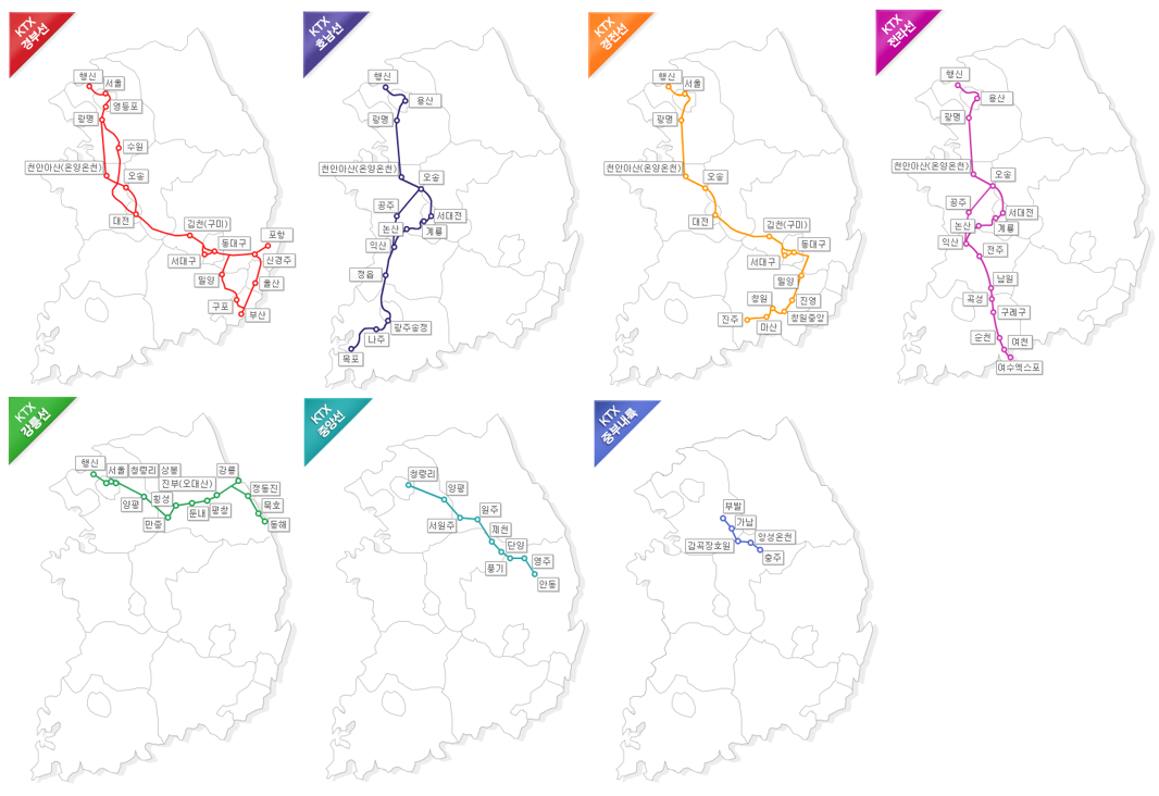KTX는 Korea Train eXpress의 줄임말로 우리나라의 대표적인 고속열차(철도)입니다. 최고속도는 시간당 300 km입니다. 전에는 서울에서 부산까지 고속도로로 가면 5시간대 그리고 새마을호 열차를 타고 가면 4시간 40분쯤 걸리던 것을 KTX로 2시간 38분이면 도착합니다. 사실 비행기로 가면 1시간 4분이면 가지만 공항에 가는 시간, 탑승 대기 시간, 그리고 내려서 또 이동하는 시간 생각하면 이게 KTX보다 더 좋다고 말하기가 쉽지 않아 보입니다. 이 KTX는 2004년 4월 1일 도입되었는데 이후 KTX-새마을-무궁화 순서로 빠른 순서 서열을 확정 지었습니다. KTX 도입 이후 서울-부산 항공수요에 대한 상당 부분을 잠식하게 되는 결과로 나타났습니다.