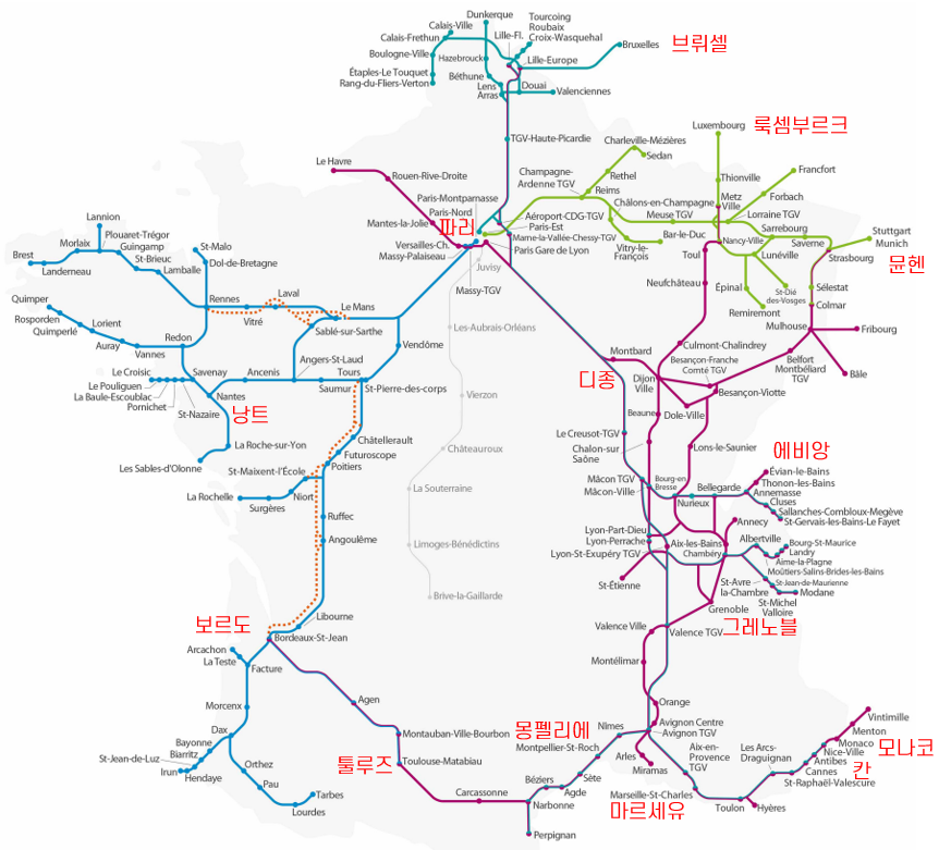 프랑스 떼제베는 국내노선은 파리, 보르도, 리옹, 마르세유, 니스, 칸 같은 최고로 멋있는 도시로 데려다줍니다. 수하물칸, 전기 콘센트, 그리고 식당칸이 별도로 있습니다. 주요 도시 간의 시간을 알아보겠습니다.