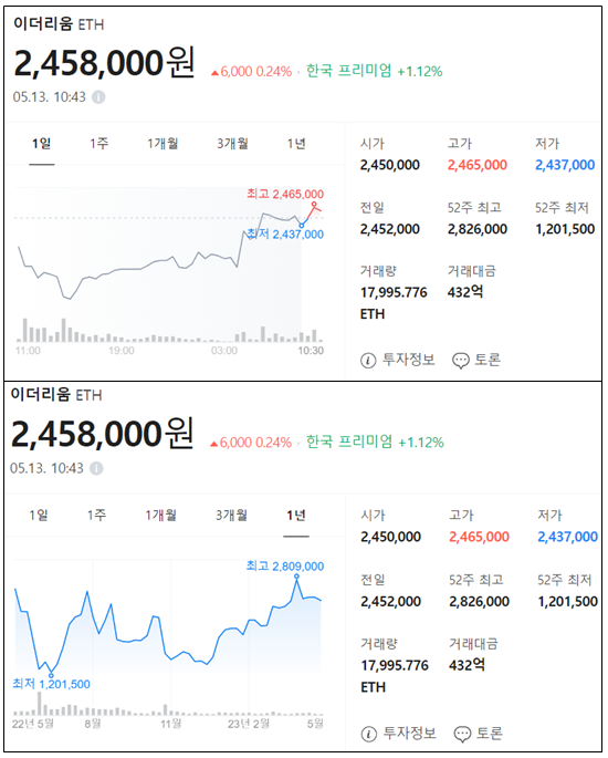 ETH로 표기하는 이더리움의 가격은 어떻게 될까요? 2023년 5월 13일 현재 1 ETH의 가격은 2,458,000원입니다. 이것도 장난이 아닙니다. 무슨 실체도 없는 가상화폐가 이렇게 비싸다는 말입니까? 이것도 수만, 수십만원이 그냥 왔다 갔다 합니다. 이더리움의 최초가격은 약 500원이었으니 지금은 4,916배나 올랐습니다. 이것도 어마어마합니다. 그러니 이 모든 가상화폐가 투기 아니겠습니까? 인생 한방이라는 것이지요.
