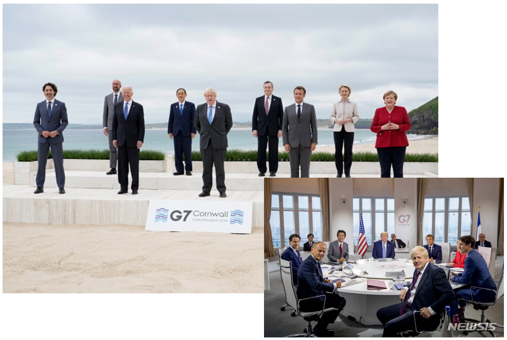 G7은 Group of Seven (7)의 줄임말로 여기에는 미국, 일본, 독일, 영국, 프랑스, 이탈리아, 캐나다가 속하는데 경제적 관점에서 강대국을 분류한 것으로 국제통화기금에서 이들 국가를 명실공히 주요 경제선진국으로 인정하며 이들 7개국이 가진 전 세계의 부의 약 60%를 가지고 있습니다. 그러므로 G7 정상회의(G7 Summit)는 한마디로 세계에서 가장 잘 사는 나라 강대국 일곱의 정상들이 모여서 국제적인 경제 문제 등을 논의하는 자리라는 것입니다. 이 G7회의에는 나라는 아니지만 유럽연합(EU)의 대표도 초청되어 회의에 참석합니다.