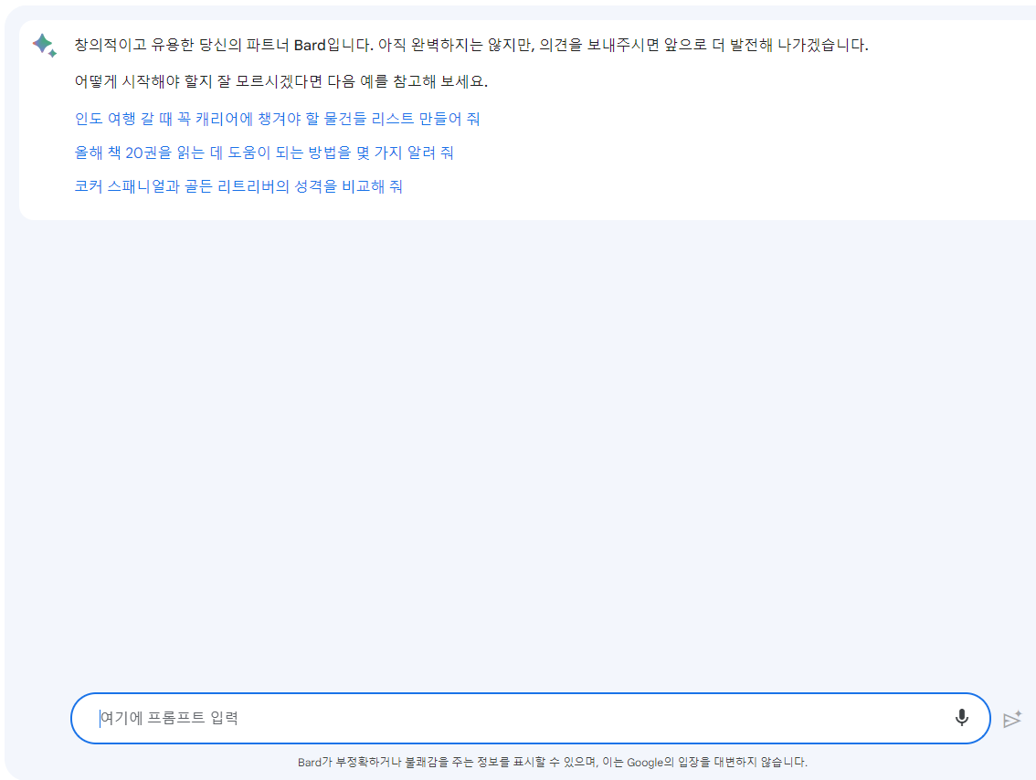 위에 있는 Bard를 사용해 보세요를 클릭하니 자동으로 구글 이메일 계정이 연동되어 사용이 가능하도록 해줍니다. 그리고 구글 메일계정으로 Bard를 사용해 보세요라고 이메일이 옵니다. 파란색의 Bard 사용해 보기를 클릭하니 바로 사용화면으로 넘어갑니다. 이 바드도 아숙업이나 챗봇과 같이 첫화면은 거의 같습니다.