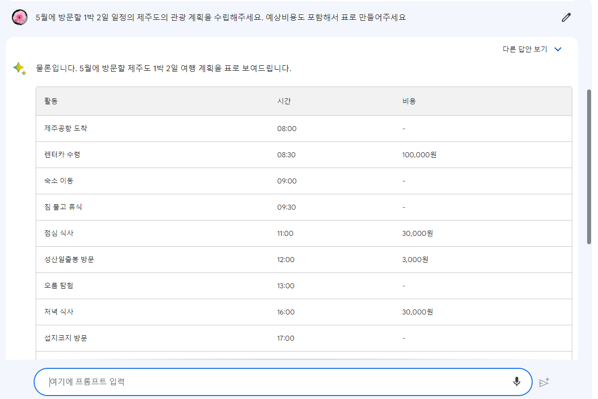 다른 것도 시켜보겠습니다. 여행 일정에 대한 것을 짜달라고 해보았습니다. 이 부분에 대한 답은 3초 정도 걸린 것 같습니다. 요청은 5월에 방문할 제주도의 1박 2일 관광계획과 예상비용을 표로 짜달라는 것이었습니다. 이에 대한 답은 아래와 같습니다. 화면이 한번에 캡쳐되지 않아서 위에만 짤라서 캡쳐를 하였습니다.