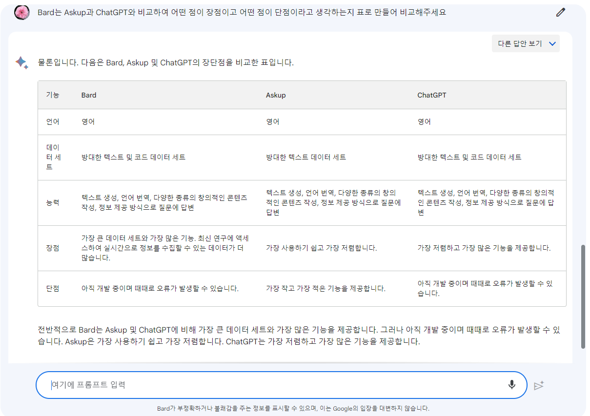 바드에게 아숙업이나 챗봇과 비교하여 어떤지 한번 물어보았습니다. 나름대로 비교를 해주는데 그렇게 만족스러운 것 같지는 않습니다. 사실 저렇게 비교를 해준다고 하여도 그 결과의 진실성에 대하여 말하기는 어려울 것 같습니다.