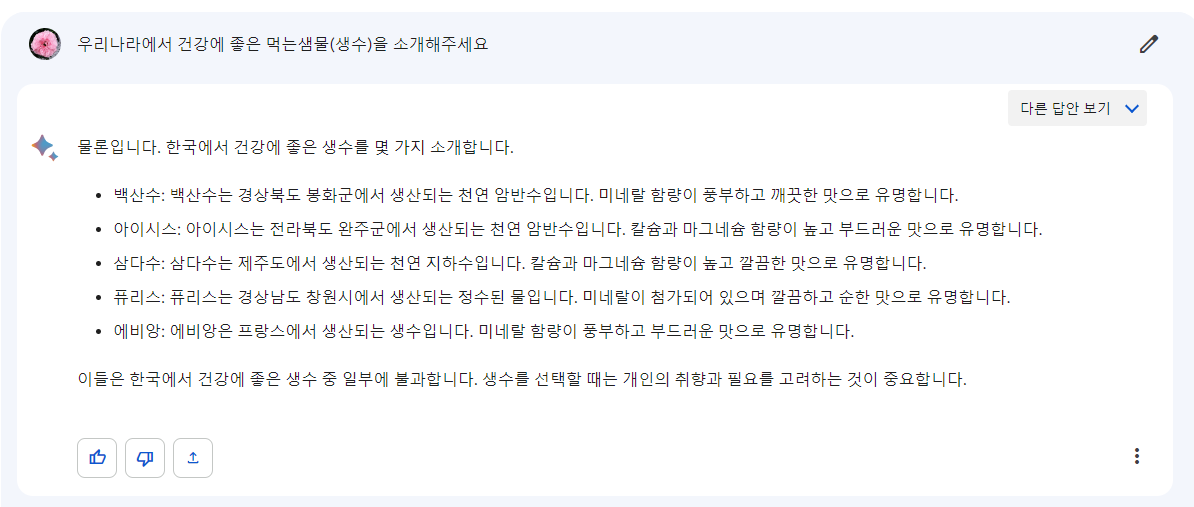 우리나라에서 건강에 좋은 먹는샘물(생수)를 소개해주세요라고 주문을 해보았습니다. 그랬더니 아래와 같은 답을 해주었습니다. 반응속도는 아숙업이나 챗지피티보다는 확실히 빠른 것 같습니다. 개인적인 느낌상 1.5초 정도 걸린 것 같습니다. 그런데 질문에 대한 답의 품질은 별로 입니다. 좋은 생수를 소개해 주려면 어떤 관점에서 어떤 기준으로 판단했을때 이런 순위로 소개를 해준다고 설명을 해야할 것 같은데 그저 시중에 시판되는 유명 생수를 단순 나열한 것 같은 느낌입니다. 이런 수준의 답으로는 사용자에게 큰 도움은 되지 않을 것 같습니다.