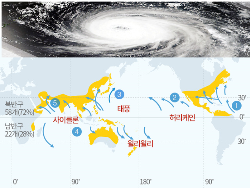그런데 열대성 저기압은 우리는 태풍이라고 하지만 어디에서 만들어지느냐에 따라 열대성 저기압의 이름이 많이 다릅니다. 우리는 태풍이라고 부르지만 북미에서는 허리케인, 인도에서는 사이클론, 호주는 윌리윌리라고 부릅니다. 이름은 다르지만 모두 강력한 열대성 저기압으로 강풍과 많은 비를 동반하여 큰 피해를 유발합니다.