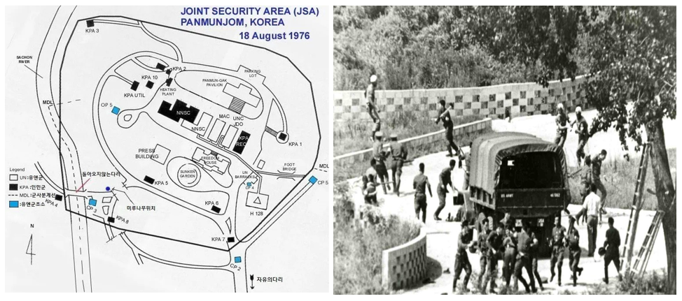 1976년 8월 18일 판문점에서 미루나무 벌목 작업을 관리하던 미국인 유엔사 장교 2명을 북한군이 살해한 사건입니다. 당시에는 공동경비구역 말그대로 군사경계선이 없이 판문점의 곳곳에 서로 섞여서 초소가 있었습니다. 그러니까 내 뒤에 적의 초소가 혼재되어 있는 형태였습니다. 이러다 보니 미루나무가 자라면서 앞쪽에 있는 유엔군 측 초소가 잘 안 보여서 안전에 위협이 되어 미루나무를 제거하는 작업을 하는 차에 북한군이 다가와 위협하고 작업을 방해하였는데 일단은 후퇴하였다가 이후 가지치기만 하는 것으로 결정하고 북한의 동의를 받아하였는데 작업을 하는 과정에서 순식간에 북한 병사들이 보니파스 대위를 구타하고 그리고 도끼로 머리를 찍어서 살해하였습니다. 그리고 이 때 함께한 바렛 중위도 구타당한 후 방치되어 사망하였습니다. 이외에도 유엔군 병사 한명을 제외하고 모두 부상을 당했습니다.