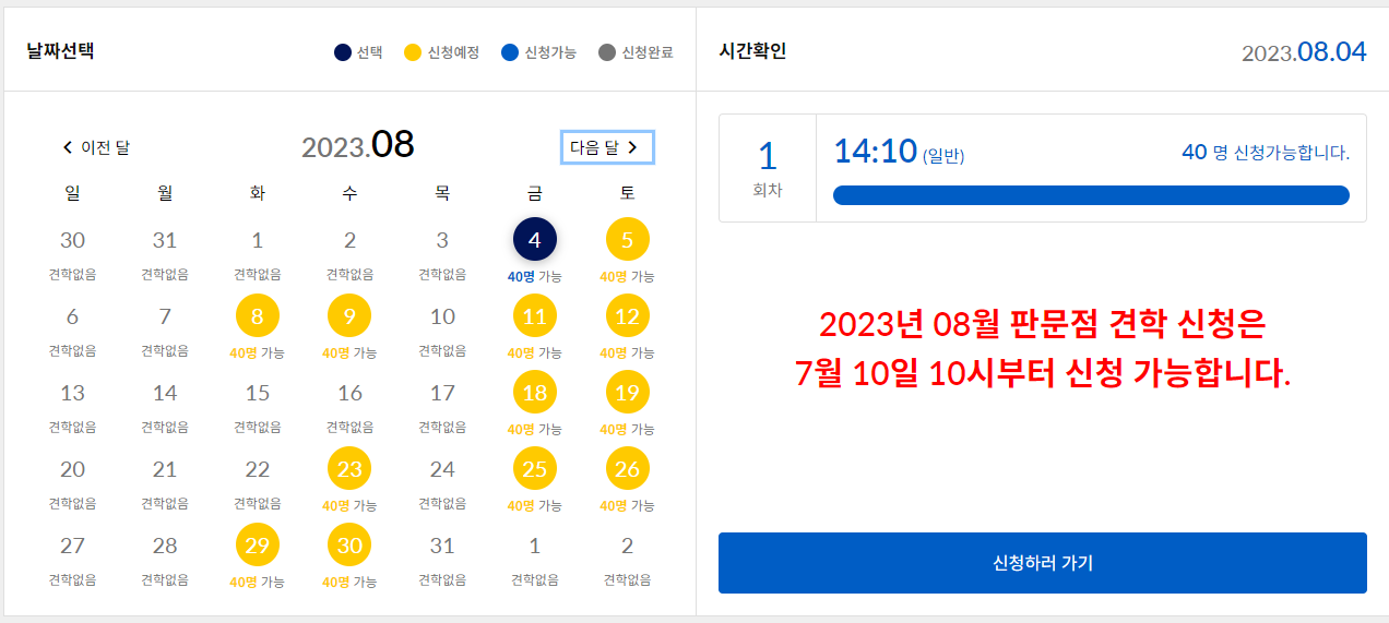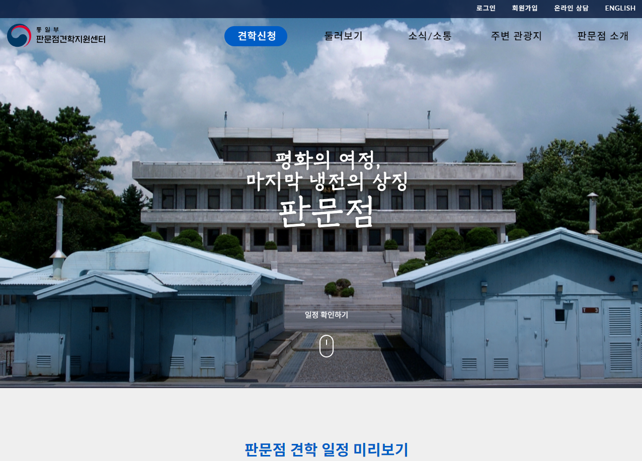 이런 분단의 현장인데 군인들만 지키는 것이 아니라 일반인들도 판문점(JSA)의 견학이 가능합니다. 통일부에서 운영하는 판문점견학지원센터에 접속하여 가능한 견학일과 견학시간을 확인하고 신청할 수 있습니다. 보통은 2달 정도는 시간을 여유있게 두고 신청하는 것이 좋습니다.