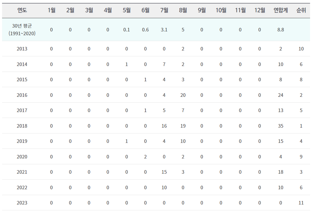 그리고 가장 긴 폭염은 역시 수도 서울에서 발생하였습니다. 2018년도에 서울의 폭염은 22일 이나 지속되었으며 2016년과 2012년에는 11일이나 지속되었습니다.