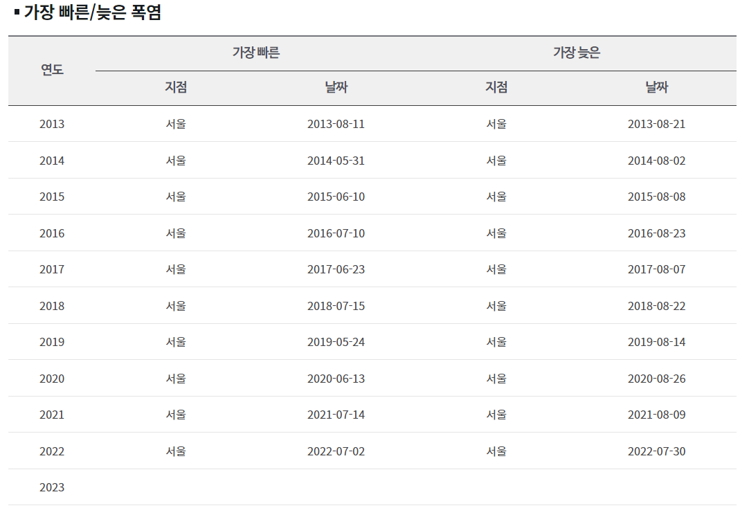 그럼 언제 가장 빠르게 폭염이 발행하였을까요? 지금이 6월 18일인데 폭염인데 이건 빠른 것일까요? 기상청의 자료를 보니 꼭 그렇지도 않습니다. 2014년도에는 5월 31일에 폭염이 발생하였고 2015년에는 6월 10일에 폭염이 발생하였습니다. 그러니 올해 6월 현재 폭염이 새삼 빠르다고 보기는 어려울 것 같습니다.