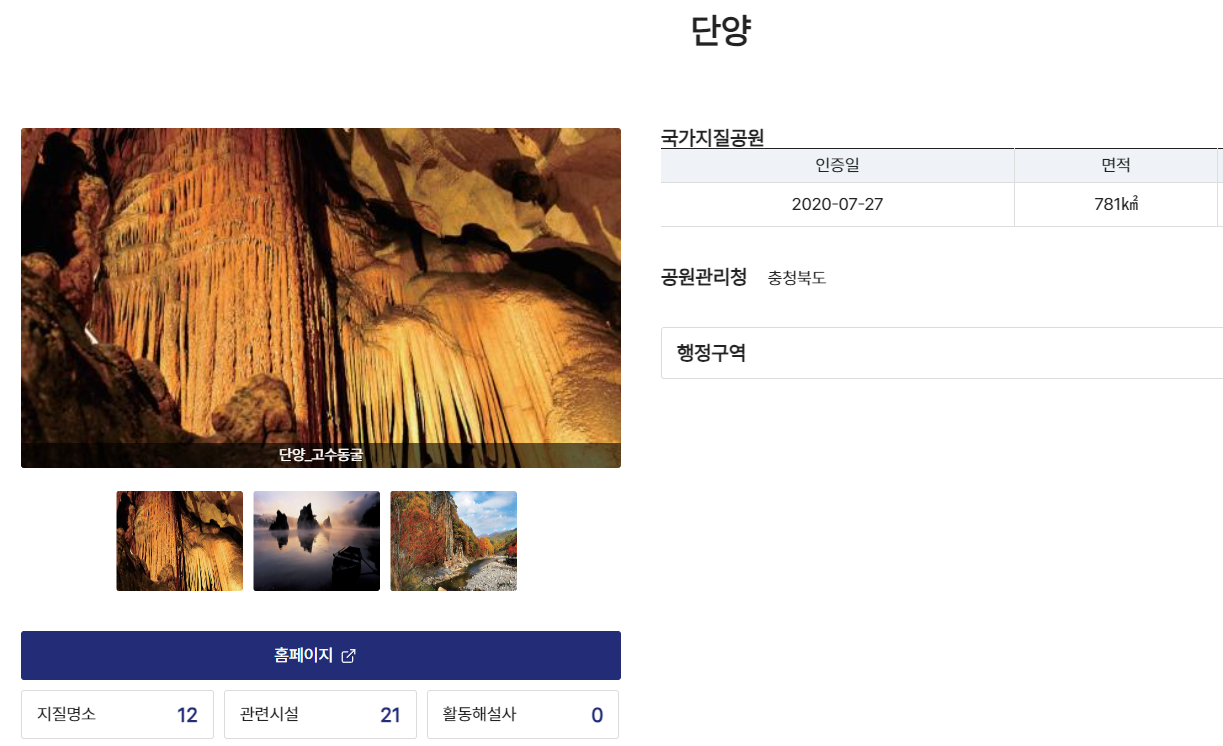 충청북도 단양군이 유네스코 지정 세계지질공원에 도전한다고 합니다. 현재 단양지질공원은 국가지질공원으로 지정되어 있는 상태입니다. 국가지질공원(National Geopark)은 지구과학적으로 중요하고 경관이 뛰어난 지역으로 자연공원법에 따라 환경부 장관이 인증한 공원을 말합니다. 국가지질공원으로 지정되면 말 그대로 지질학적 가치를 국가와 전문가들로부터 공인받는 셈입니다. 2023년 6월 현재 국가지질공원은 총 17개소입니다. 아래 사진에는 13개소만 표시되어 있지만 그것은 2020년 7월 기준이고 그 사이 4개소(고군산군도 지질공원, 화성 지질공원, 의성지질공원, 문경 지질공원)가 추가되어 총 17개소입니다.