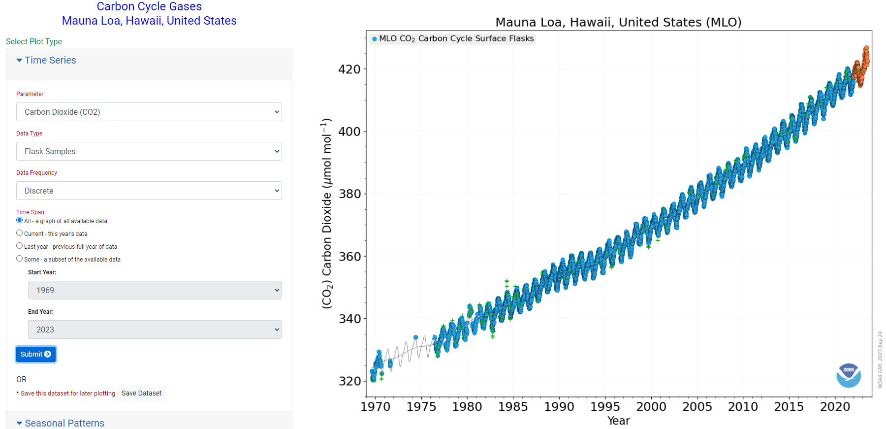 이 중에서 특별히 이산화탄소 농도를 선택하여 보았습니다. 자료는 1969년부터 2023년까지 보여주는데 지속적으로 이산화탄소 농도가 증가하는 것을 보고 있는데 소름이 끼칩니다. 무섭기도 하고요. 정말로 지구의 이산화탄소 농도가 계속 증가하고 있으며 그에 따라 지구 대기온도도 증가하고 있다고 생각하니 끔찍합니다. 킬링 교수의 아들 킬링 교수가 언제가 그 곡선이 꺾이는 것을 보고 싶다고 인터뷰를 하였는데 정말로 우리가 경각심을 가지고 노력을 해야 할 것 같습니다. 이러다가 더워서 죽습니다.