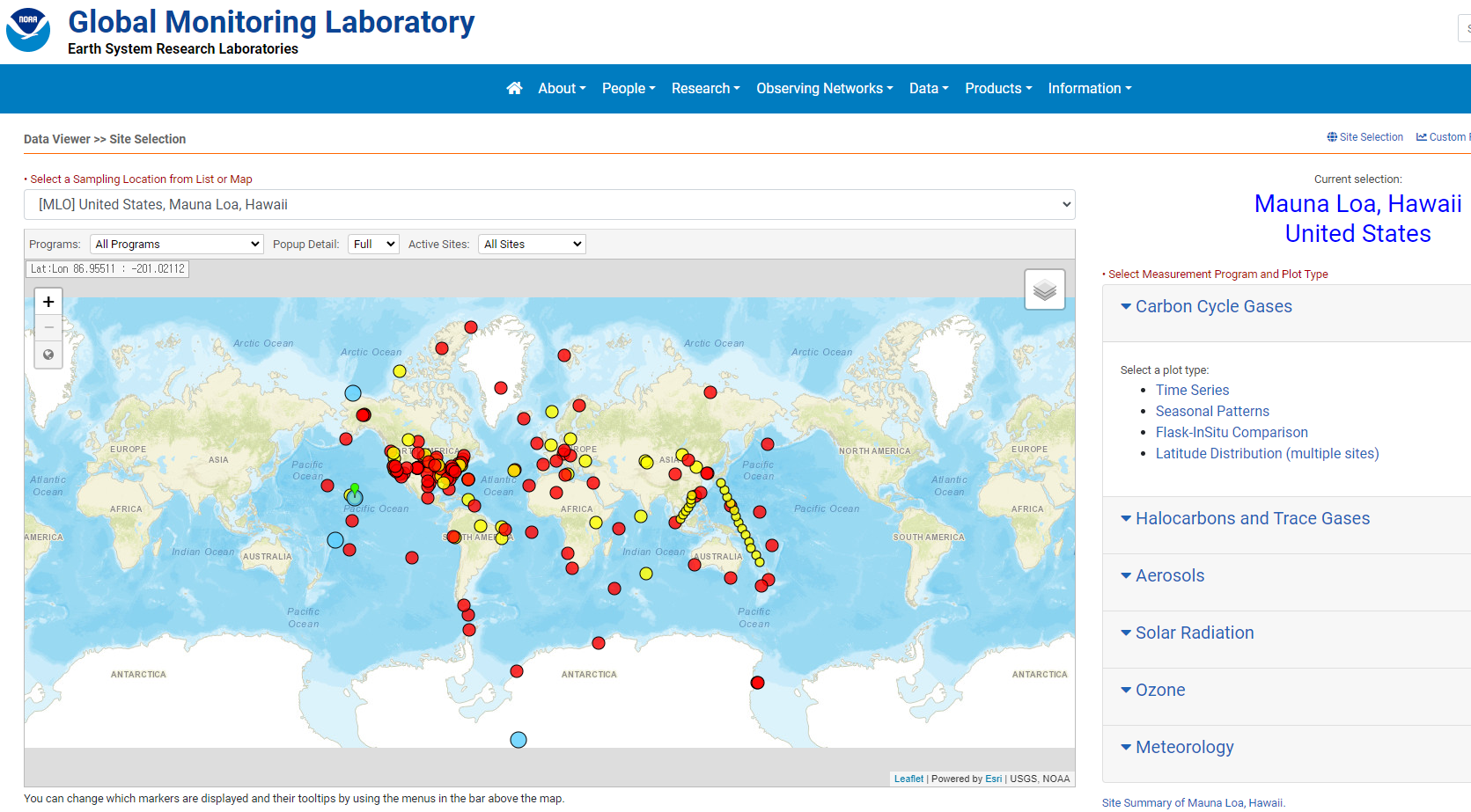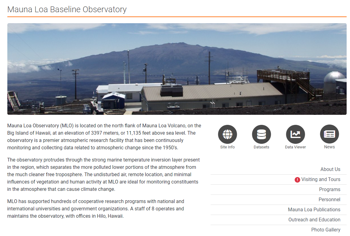 NOAA에 소속된 마우나로아 관측소에 들어가면 그동안 관측한 각종 자료들을 볼 수 있습니다. 이산화탄소, 할로탄화수소, 에어로졸, 태양복사열, 오존 등을 시계열적으로 볼 수 있습니다.