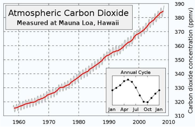 미국의 하와이 마우나로아 관측소에서는 지속적으로 대기 중의 이산화탄소의 변동경향을 모니터링합니다. 여기가 전 세계의 대표되는 관측지점이라고 보면 됩니다. 지구의 기후변화 혹은 기후온난화를 직접적으로 증명한 자료도 바로 이곳에서 만들어진 것입니다.