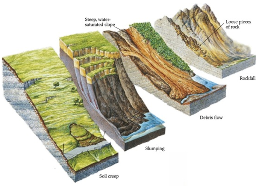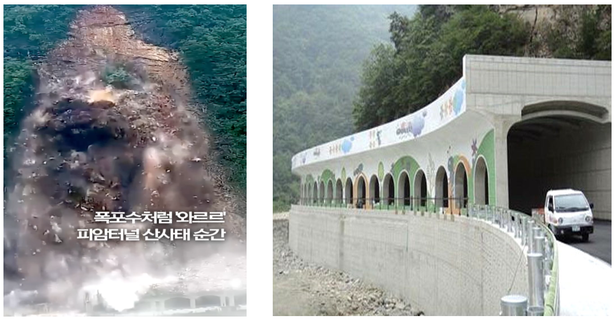 산사태는 보통 4가지 종류로 구분하고 있습니다. 첫번째는 Soil Creep입니다. 이것은 천천히 토양이 천천히 이동하는 것입니다. 그래서 사실은 인지하는 것이 쉽지 않고 해당 지역에 그렇게 크게 피해를 주지는 않습니다. 두 번째는 Slumping입니다. 슬럼핑은 Soil Creep이 급격하게 일어나는 것을 말합니다. 토양층이 경사면을 따라 빠르게 이동하는 것을 의미합니다. 이는 상당히 심대한 피해를 유발할 수 있습니다. 세 번째는 Debris Flow입니다. 이는 경사면의 토양이 물로 포화될 때 발생합니다. 이렇게 되면 상부의 토양이나 암반층이 순식간에 경사면을 따라 흘러내리게 됩니다. 그리고 마지막으로 네 번째는 Rock Fall입니다. 이것은 폭우가 내릴 경우 경사면의 암반이 느슨해지면서 갑자기 산사태가 발생하는 것을 말합니다. 보통의 경우 산사태는 강한 비가 오는 여름 장마철에 많이 발생합니다. 즉 약해진 지반에 강우가 트리거의 역할을 하는 것입니다.