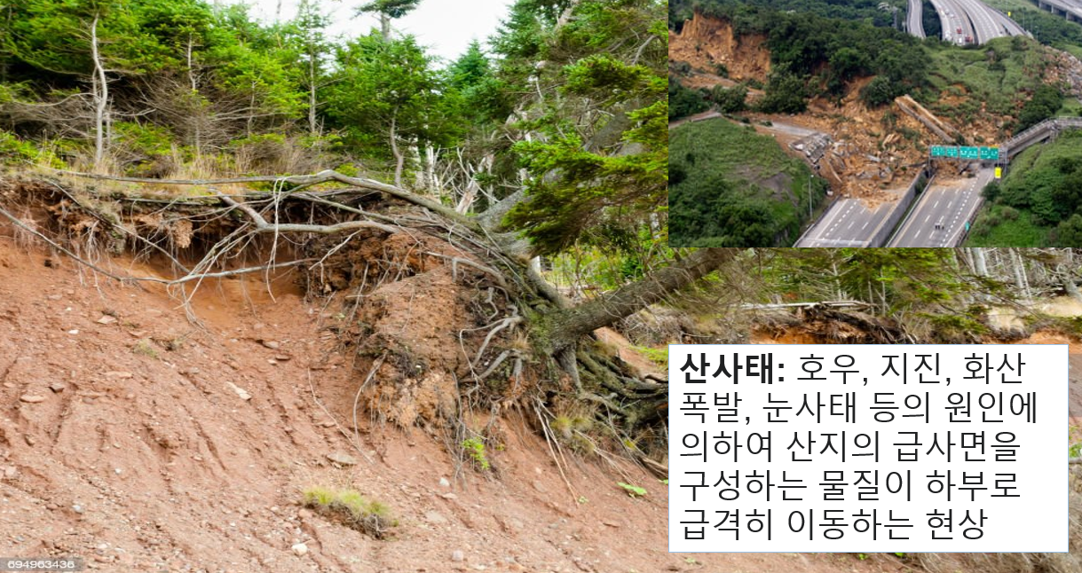 산사태는 호우, 지진, 화산, 눈사태 등의 원인에 의해서 산지의 급경사면을 구성하는 물질(토양과 암반)이 아래로 급격히 이동하는 현상을 말합니다. 특히 비가 많이 내리는 여름에 산사태가 더욱 많이 발생합니다.